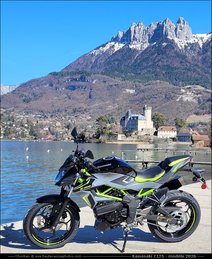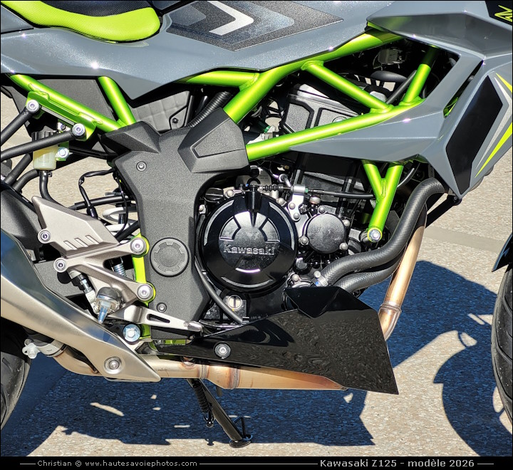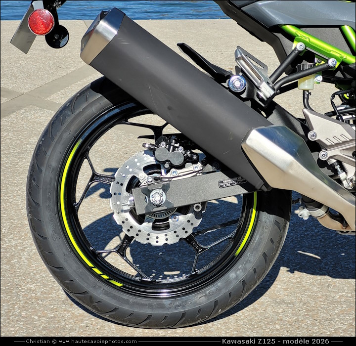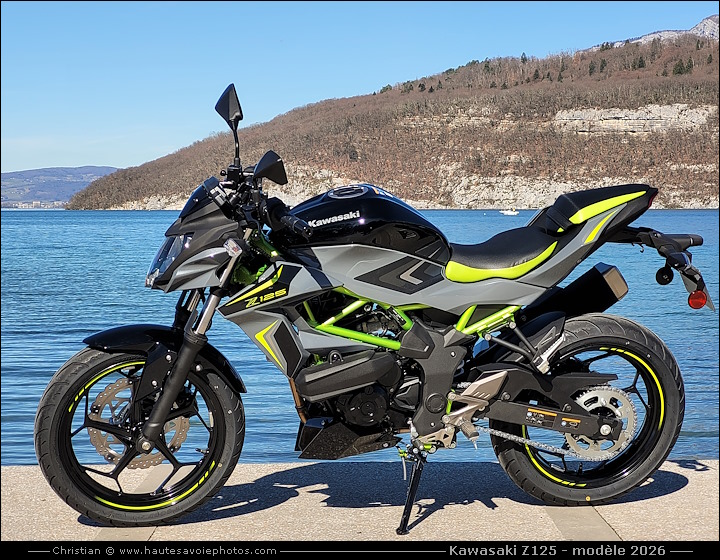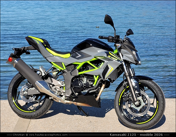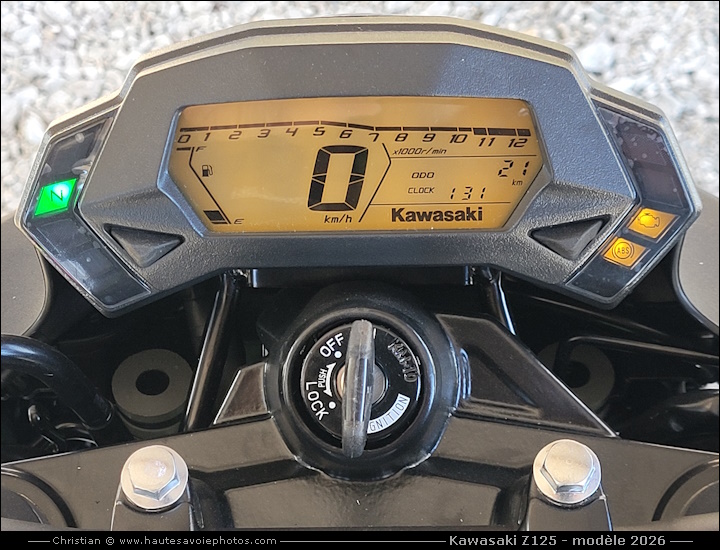 ![]() Photo : KAWASAKI Z125 petit rodage de 100km - Lieu : Duingt - Appareil : Samsung S20FE - JPG de 12 Mpixels en 2026 - © Christian Moteur : mono-cylindre de 125cm³, 4 temps, double ACT, 4 soupapes, puissance 15ch à 10000tr/min, couple 11.7 Nm à 7700tr/min. Boite 6 vitesses. Cadre tubulaire acier. Fourche AV Ø37 débatement 110mm, amortisseur AR Uni-Trak débatement 120mm. Frein avant à simple disque 290mm, frein arrière à simple disque 220mm. Pneu avant 100/80-17, pneu arrière 130/70-17. Hauteur de selle 815mm, garde au sol 185mm, empattement 1330mm, réservoir de 11L, poids 147kg tous pleins faits. ![]() Photo : KAWASAKI Z125 modèle 2026 - Lieu : Duingt - Appareil : Samsung S20FE - JPG de 12 Mpixels en 2026 - © Christian ![]() Photo : KAWASAKI Z125 modèle 2026 - Lieu : Duingt - Appareil : Samsung S20FE - JPG de 12 Mpixels en 2026 - © Christian ![]() Photo : compteur de la KAWASAKI Z125 - Lieu : Duingt - Appareil : Samsung S20FE - JPG de 12 Mpixels en 2026 - © Christian ![]() Photo : roue avant de la KAWASAKI Z125 - Lieu : Duingt - Appareil : Samsung S20FE - JPG de 12 Mpixels en 2026 - © Christian ![]() Photo : moteur de la KAWASAKI Z125 - Lieu : Duingt - Appareil : Samsung S20FE - JPG de 12 Mpixels en 2026 - © Christian ![]() Photo : roue arrière de la KAWASAKI Z125 - Lieu : Duingt - Appareil : Samsung S20FE - JPG de 12 Mpixels en 2026 - © Christian