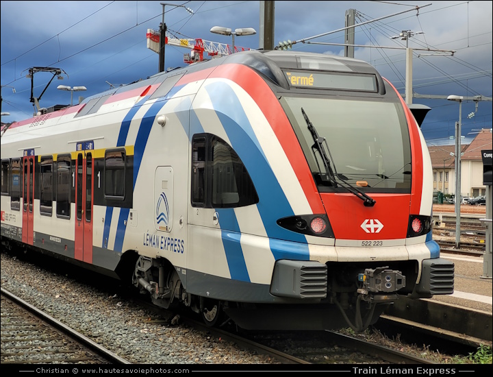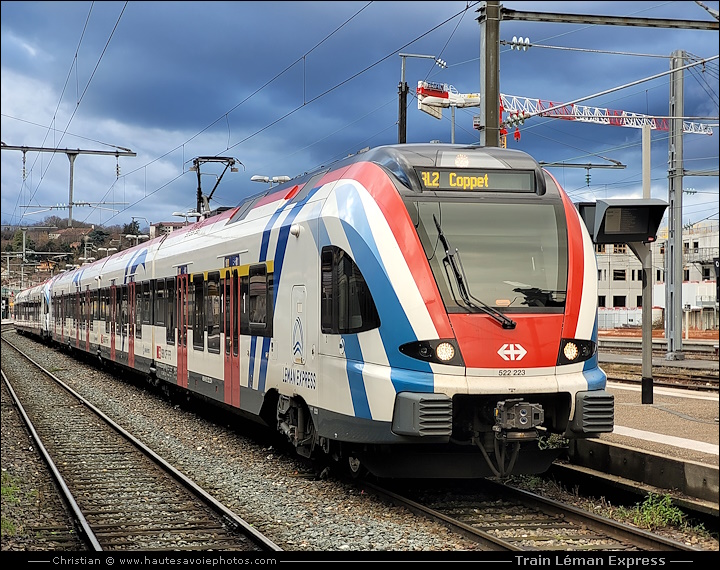 ![]() Photo : rame Flirt de Stadler des CFF - Lieu : gare d'Annecy - Appareil : Samsung S20FE - JPG de 12 Mpixels en 2026 - © Christian Le Léman Express est le premier RER transfrontalier France-Suisse. En 2022 la fréquentation atteignait 70000 passagers/jour La flotte est composée de trains Flirt du constructeur suisse Stadler et de trains Régiolis du constructeur français Alstom. Sept lignes desservent des villes suisses et françaises sur un réseau de 230 kilomètres de voies ferrées.. ![]() Photo : Léman Express rame des CFF - Lieu : gare d'Annecy - Appareil : Samsung S20FE - JPG de 12 Mpixels en 2026 - © Christian ![]() Photo : Léman Express rame des CFF - Lieu : gare d'Annecy - Appareil : Samsung S20FE - JPG de 12 Mpixels en 2026 - © Christian ![]() Photo : rame Flirt de Stadler suisse - Lieu : gare d'Annecy - Appareil : Samsung S20FE - JPG de 12 Mpixels en 2026 - © Christian ![]() Photo : bogie de la motrice Stadler - Lieu : gare d'Annecy - Appareil : Samsung S20FE - JPG de 12 Mpixels en 2026 - © Christian ![]() Photo : bogie des voitures voyageurs - Lieu : gare d'Annecy - Appareil : Samsung S20FE - JPG de 12 Mpixels en 2026 - © Christian ![]() Photo : rame Régiolis d'Alstom de la SNCF - Lieu : gare d'Annecy - Appareil : Samsung S20FE - JPG de 12 Mpixels en 2026 - © Christian ![]() Photo : Léman Express rame de la SNCF - Lieu : gare d'Annecy - Appareil : Samsung S20FE - JPG de 12 Mpixels en 2026 - © Christian |