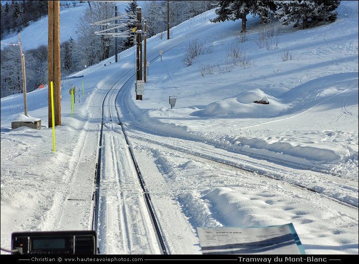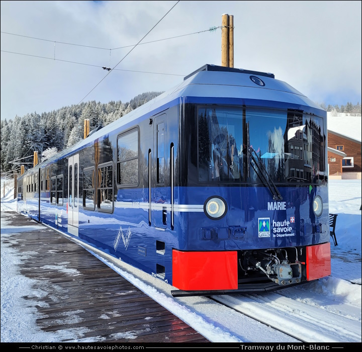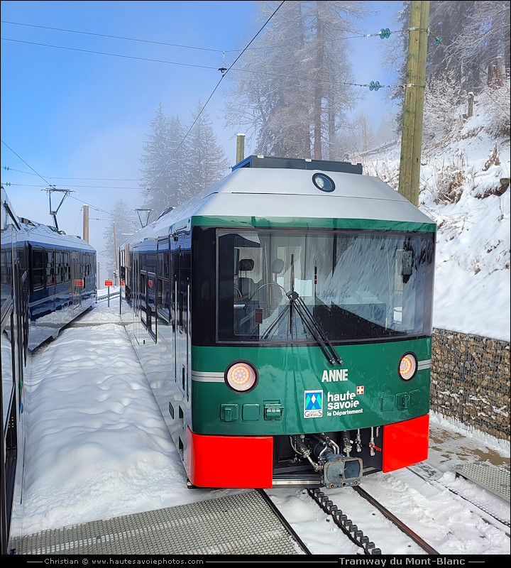 ![]() Photo : Marie et Anne à la gare - Lieu : Saint-Gervais - Appareil : Samsung S20 FE - JPG de 12 Mpixels en 2023 - © Christian En 2022 les rames d'anciennes générations sont remplacées par 3 nouvelles. Capacité de 120 places assises et 80 debouts. Le trio historique des motrices électriques est rejoint par une quatrième rame blanche, qui sera baptisée : Marguerite. La vitesse de pointe passe de 15km/h pour les anciennes à 20km/h pour les nouvelles, réduisant ainsi le temps de trajet. Les nouvelles matrices électriques bénéficient d’un système de recharge à la descente, pour optimiser leur consommation. L'hiver du Fayet ou Saint-Gervais le TMB vous emmène au plateau de Bellevue à 1794m et l'été au Nid d'Aigle à 2372m. ![]() Photo : Anne, rame arrivée en 2022 - Lieu : Saint-Gervais - Appareil : Samsung S20 FE - JPG de 12 Mpixels en 2023 - © Christian ![]() Photo : Anne à la gare TMB - Lieu : Saint-Gervais - Appareil : Samsung S20 FE - JPG de 12 Mpixels en 2023 - © Christian ![]() Photo : Marie, rame arrivée en 2022 - Lieu : Saint-Gervais - Appareil : Samsung S20 FE - JPG de 12 Mpixels en 2023 - © Christian ![]() Photo : Marie à la gare TMB - Lieu : Saint-Gervais - Appareil : Samsung S20 FE - JPG de 12 Mpixels en 2023 - © Christian ![]() Photo : Jeanne et Marguerite à la gare - Lieu : Saint-Gervais - Appareil : Samsung S20 FE - JPG de 12 Mpixels en 2023 - © Christian ![]() Photo : Marguerite arrivée en 2022 - Lieu : Saint-Gervais - Appareil : Samsung S20 FE - JPG de 12 Mpixels en 2023 - © Christian ![]() Photo : Marguerite à la gare TMB - Lieu : Saint-Gervais - Appareil : Samsung S20 FE - JPG de 12 Mpixels en 2023 - © Christian ![]() Photo : croisement de Marie et Anne - Lieu : Saint-Gervais - Appareil : Samsung S20 FE - JPG de 12 Mpixels en 2026 - © Christian ![]() Photo : Marie au Col de Voza 1653m - Lieu : Saint-Gervais - Appareil : Samsung S20 FE - JPG de 12 Mpixels en 2026 - © Christian ![]() Photo : Marie à Bellevue 1794m en hiver - Lieu : Saint-Gervais - Appareil : Samsung S20 FE - JPG de 12 Mpixels en 2026 - © Christian ![]() Photo : Poste de pilotage de Marie - Lieu : Saint-Gervais - Appareil : Samsung S20 FE - JPG de 12 Mpixels en 2023 - © Christian ![]() Photo : Poste de pilotage de Marie - Lieu : Saint-Gervais - Appareil : Samsung S20 FE - JPG de 12 Mpixels en 2023 - © Christian ![]() Photo : Intérieur du Tramway du Mont-Blanc - Lieu : Saint-Gervais - Appareil : Samsung S20 FE - JPG de 12 Mpixels en 2023 - © Christian ![]() Photo : loco déneigeuse diesel du TMB à Saint-Gervais - Appareil : Samsung S20 FE - JPG de 12 Mpixels en 2026 - © Christian ![]() Photo : voie enneigée du TMB - Lieu : Saint-Gervais - Appareil : Samsung S20 FE - JPG de 12 Mpixels en 2026 - © Christian ![]() Photo : voie enneigée du TMB à Voza - Lieu : Saint-Gervais - Appareil : Samsung S20 FE - JPG de 12 Mpixels en 2026 - © Christian ![]() Photo : Loco à vapeur de 1909 à 1956 - Lieu : Le Fayet - Appareil : Canon G5X - JPG de 20 Mpixels en 2021 - © Christian ![]() Photo : Gare de départ au Fayet à 580m - Lieu : Haute-Savoie - Appareil : Canon G5X - JPG de 20 Mpixels en 2021 - © Christian ![]() Photo : Gare (avant rénovation) de Saint-Gervais à 890m - Appareil : Canon G5X - JPG de 20 Mpixels en 2021 - © Christian ![]() Photo : Gare (après rénovation) de Saint-Gervais à 890m - Appareil : Samsung S20 FE - JPG de 10 Mpixels en 2022 - © Christian ![]() Photo : Jeanne la motrice rouge du TMB - Lieu : Nid g'Aigle 2372m - Appareil : Canon G5X - JPG de 20 Mpixels en 2021 - © Christian Le TMB, train à crémaillère le plus haut de France, il y avait 3 rames (nommées Anne, Jeanne, Marie) pour un voyage hors du temps. Départ de la gare du Fayet (580 m) ou de Saint-Gervais (792 m), le Tramway du Mont-Blanc monte jusqu'au Nid d'Aigle (2372 m), porte d'entrée de la voie royale du Mont-Blanc, avec une belle vue sur le glacier de et l'aiguille de Bionnassay (4052m). La ligne (12,4 km et pente à 15% en moy)¨a été construite de 1905 à 1913. Electrification en 1955, courant 11000 V à 50 Hz. Les 3 rames à moteur électrique sont reçues en 1957. Elles portent les prénoms des 3 filles du directeur Pierre Noury. Une rame comporte la motrice (de 15,40 m et 31,4 tonnes, puissance 640 cv) et une remorque de 13,7 m. Vitesse 15 km/h. ![]() Photo : Anne la motrice verte du TMB - Lieu : Nid g'Aigle 2372m - Appareil : Canon G5X - JPG de 20 Mpixels en 2021 - © Christian ![]() Photo : Marie la motrice bleue du TMB - Lieu : Saint-Gervais - Appareil : Canon G5X - JPG de 20 Mpixels en 2021 - © Christian ![]() Photo : Poste de contrôle de la rame du TMB - Lieu : Saint-Gervais - Appareil : Canon G5X - JPG de 20 Mpixels en 2021 - © Christian ![]() Photo : Intérieur du Tramway du Mont-Blanc - Lieu : Le Fayet - Appareil : Canon G5X - JPG de 20 Mpixels en 2021 - © Christian ![]() Photo : Voie métrique à crémaillère Strub - Lieu : Saint-Gervais - Appareil : Canon G5X - JPG de 20 Mpixels en 2021 - © Christian ![]() Photo : Bogie de la motrice Jeanne - Lieu : Le Fayet - Appareil : Canon G5X - JPG de 20 Mpixels en 2021 - © Christian ![]() Photo : Bogie de la remorque de Jeanne - Lieu : Le Fayet - Appareil : Canon G5X - JPG de 20 Mpixels en 2021 - © Christian ![]() Photo : Jeanne sortant du garage TMB - Lieu : Le Fayet - Appareil : Canon G5X - JPG de 20 Mpixels en 2021 - © Christian ![]() Photo : Jeanne à la gare - Lieu : Saint-Gervais - Appareil : Canon G5X - JPG de 20 Mpixels en 2021 - © Christian ![]() Photo : Marie quittant la gare - Lieu : Saint-Gervais - Appareil : Canon G5X - JPG de 20 Mpixels en 2021 - © Christian ![]() Photo : Anne à la gare - Lieu : Saint-Gervais - Appareil : Samsung S20 FE - JPG de 10 Mpixels en 2022 - © Christian ![]() Photo : Voies de croisement - Lieu : Col de Voza - Appareil : Canon G5X - JPG de 20 Mpixels en 2021 - © Christian ![]() Photo : Voie à crémaillère du TMB - Lieu : Saint-Gervais - Appareil : Canon G5X - JPG de
