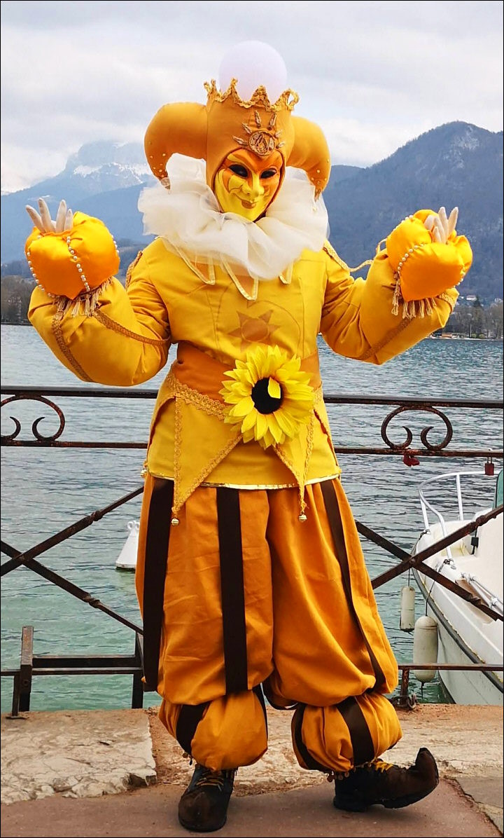Photo : costumé Arlequin jaune au bord du lac - Lieu : Annecy - cliché trouvé sur Facebook en mars 2026