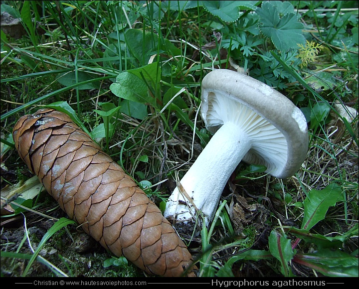 ![]() Photo : Hygrophorus agathosmus - Lieu : Saint Jorioz - Appareil : Fujifilm S6500 - JPG de 6 Mpixels en 2007 - © Christian ![]() Photo : Hygrophore odorant - Lieu : Saint Jorioz - Appareil : Fujifilm S6500 - JPG de 6 Mpixels en 2007 - © Christian - Chapeau : ø 3 à 10cm, gris pale à gris brun, parfois beige, convexe, parfois déprimé, lisse, marge enroulée à incurvée au début puis étalée. Chair : blanche, juteuse, odeur caractéristique de colle de bureau - Lames : blanches, décurrentes, espacées, épaisses - Sporée : blanche. Pied : blanc parfois taché de gris-brun, cylindrique, atténué à la base, plein, sec, pruineux au début ou finement squamuleux vers l'apex. Habitat : dans les bois mêlés humides, dans les feuilles ou la mousse - Visible : septembre à novembre, peu courant. |