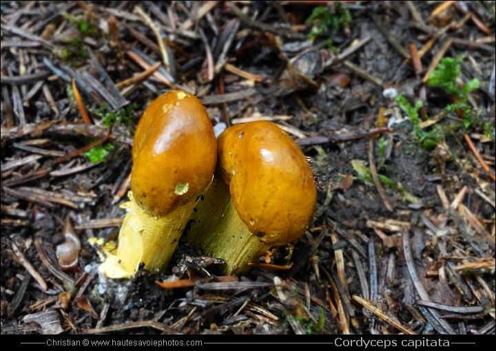 ![]() Photo : Cordyceps capitata - Lieu : Minzier - Appareil : Nikon P7100 - JPG de 5 Mpixels en 2013 - © Christian ![]() Photo : parasite de la Truffe des cerfs - Lieu : Minzier - Appareil : Nikon P7100 - JPG de 5 Mpixels en 2013 - © Christian ![]() Photo : Cordyceps sur la truffe - Lieu : Minzier - Appareil : Nikon P7100 - JPG de 5 Mpixels en 2013 - © Christian - Chapeau : ø 5 à 15mm, fauve doré à brun ochracé, cuticule mate, en forme de calote plus ou moins sphérique. Pied : 2 à 5cm, jaunâtre à ochracé, clair à la base, mat, ridulé - Chair : blanchâtre - Lames : néant - Sporée : crème ou jaunâtre. Habitat : pousse en parasite sur Elaphomyces granulatus enfouis dans les bois de conifères - Visible : septembre à novembre. |