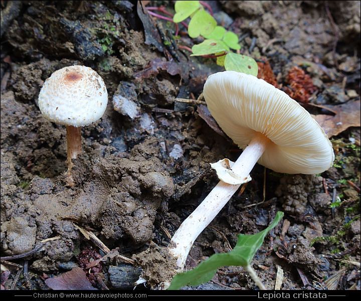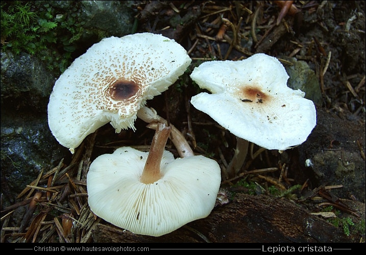 ![]() Photo : Lépiote crêtée - Lieu : Saint Jorioz - Appareil : Canon G5X - JPG de 20 Mpixels en 2020 - © Christian ![]() Photo : Lepiota cristata - Lieu : Saint Jorioz - Appareil : Canon G5X - JPG de 20 Mpixels en 2020 - © Christian ![]() Photo : Lépiote crêtée - Lieu : Saint Jorioz - Appareil : Nikon P7100 - JPG de 10 Mpixels en 2012 - © Christian ![]() Photo : Lepiota cristata - Lieu : Saint Jorioz - Appareil : Canon IXUS 400 - JPG de 4 Mpixels en 2006 - © Christian ![]() Photo : Lépiote crêtée - Lieu : Saint Jorioz - Appareil : LG Nexus 5 - JPG de 8 Mpixels en 2014 - © Christian ![]() Photo : Lepiota cristata - Lieu : Saint Jorioz - Appareil : Fujifilm S6500 - JPG de 6 Mpixels en 2010 - © Christian - Chapeau : ø 2 à 5cm, blanc couvert d'écailles rousses, mamelon brun-roux, hémisphérique à conique puis étalé avec mamelon marqué. Chair : Blanchâtre à rosée, mince, odeur désagréable de scléroderme - Lames : blanches, libres, épaisses, serrées - Spores : crème. Pied : blanc parfois teinté de rose brunâtre, fin, souvent sinueux, lisse - Anneau : blanc, fragile, disparaissant rapidement. Habitat : bois aérés de feuillus ou de résineux, lisières ou clairières, parcs et pelouses arborés - Visible : juillet à novembre. |