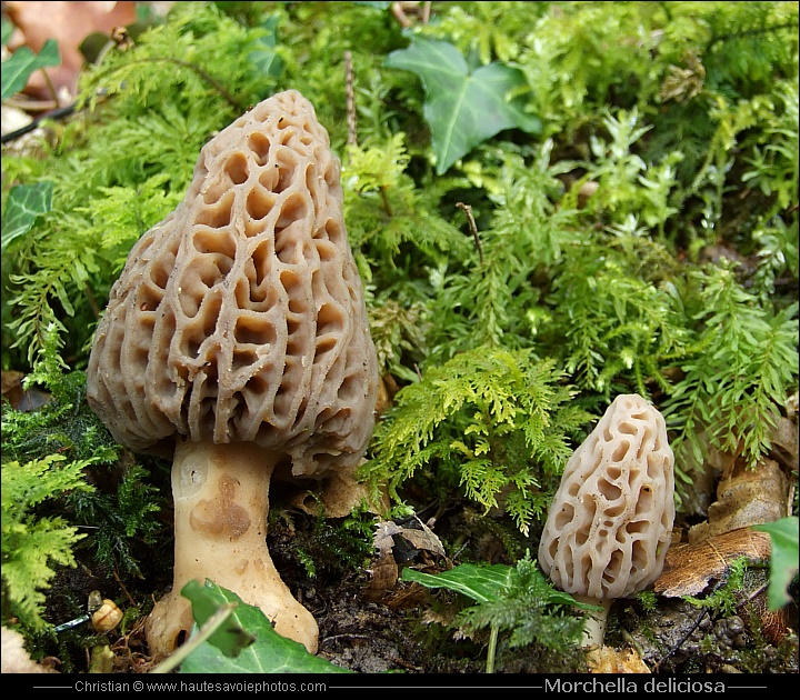 ![]() Photo : Morchella deliciosa - Lieu : Saint Eustache : Appareil : Fujifilm S6500 - JPG de 6 Mpixels en 2007 - © Christian ![]() Photo : Morille délicieuse - Lieu : Saint Jorioz - Appareil : Fujifilm S6500 - JPG de 6 Mpixels en 2008 - © Christian - Chapeau : ø 5 à 12cm, griseâtre à brun, creux, allongé et conique, dissymétrique : côtes rectilignes d'un côté, plus courbes de l'autre. Lames : néant - Chair : blanchâtre, charnue, tendre et léger parfum de pomme et de miel - Spores : lisses, ochracées. Pied : 2 à 4cm de haut, mesurant à peu près la moitié du chapeau, blanc à jaunâtre terne, creux, base souvent renflé et sillonée. Habitat : bois de conifères, les clairières, sur les tas de bois, souvent près des fougères - Visible : avril et mai. |