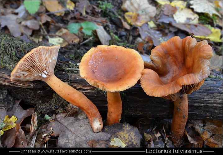 ![]() Photo : Lactarius fulvissimus - Lieu : Saint Jorioz - Appareil : Nikon D7000 - JPG de 16 Mpixels en 2012 - © Christian ![]() Photo : Lactaire fauve - Lieu : Saint Jorioz - Appareil : Nikon D7000 - JPG de 16 Mpixels en 2012 - © Christian - Chapeau : ø 4 à 9cm, ocre ou brun orangé vif devenant plus clair à la marge enroulée puis ondulée, convexe puis s'aplatissant avec une dépression. Chair : crème à ocre pâle, amère - Lames : crème à ocre, décurrentes, assez serrées - Lait : blanc, peu abondant, immuable - Spores : subréticulées. Pied : roux au sommet puis s’assombrissant vers la base, cylindrique ou irrégulier, nervuré, souvent atténué vers la base, ferme devenant creux. Habitat : dans les bois de feuillus (charmes et châtaigniers) mais parfois aussi sous résineux comme l'épicéa - Visible : août à novembre . |