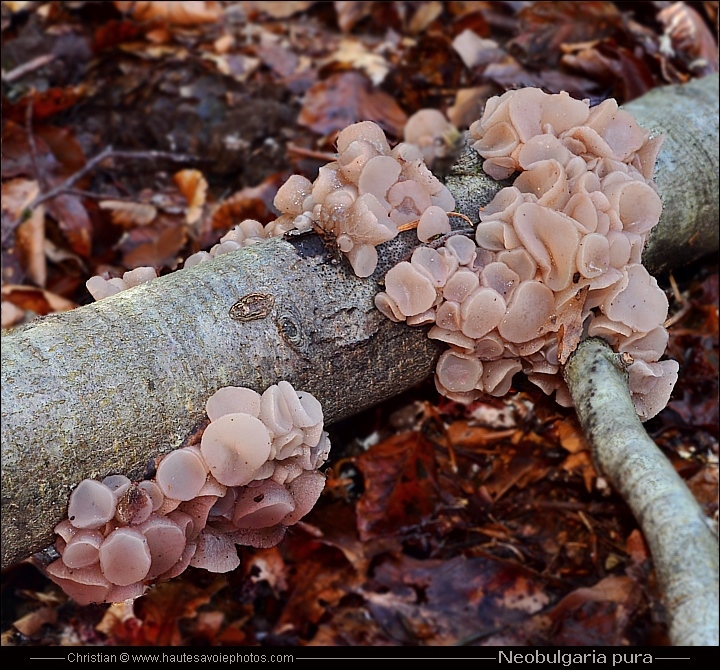 ![]() Photo : Neobulgaria pura - Lieu : Borny - Appareil : Nikon D7000 - JPG de 16 Mpixels en 2016 - © Christian ![]() Photo : Neobulgaria pura - Lieu : Borny - Appareil : Nikon D7000 - JPG de 16 Mpixels en 2016 - © Christian ![]() Photo : Pézize pure - Lieu : Borny - Appareil : LG Nexus 5 - JPG de 8 Mpixels en 2016 - © Christian - Chapeau : ø 1 à 2,5cm blanchatre à rosâtre teinté parfois de violet, en cône au début puis s'étalant en coupe pour finir en disque. Chair : rosâtre, molle, gélatineuse, sans odeur ni saveur - Lames : néant - Sporée : incolores, transparentes - Pied : néant. Habitat : poussant en touffes sur les souches, les troncs couchés de hêtres - Visible : automne et hiver doux. |