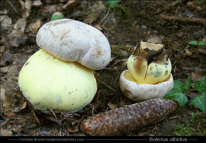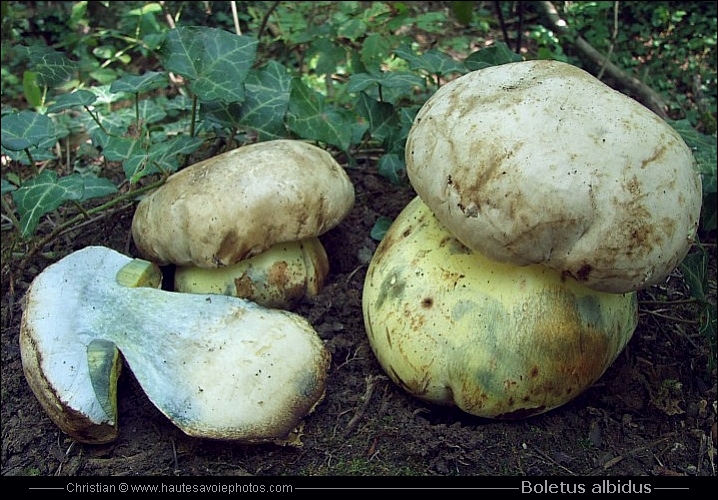 ![]() Photo : jeunes Boletus radicans - Lieu : Saint Jorioz - Appareil : Canon IXUS 400 - JPG de 4 Mpixels en 2009 - © Christian ![]() Photo : Bolet radicant - Lieu : Saint Jorioz - Appareil : Nikon P7100 - JPG de 10 Mpixels en 2012 - © Christian ![]() Photo : Boletus albidus avec une coupe - Lieu : Saint Jorioz - Appareil : Fujifilm S6500 - JPG de 6 Mpixels en 2009 - © Christian ![]() Photo : Boletus albidus - Lieu : Saint Jorioz - Appareil : Nikon D7000 - JPG de 16 Mpixels en 2016 - © Christian ![]() Photo : énorme et vieux Boletus radicans - Lieu : Annecy - Appareil : Nikon P7100 - JPG de 10 Mpixels en 2012 - © Christian ![]() Photo : dessous du vieux Boletus radicans - Lieu : Annecy - Appareil : Nikon P7100 - JPG de 10 Mpixels en 2012 - © Christian ![]() Photo : Boletus radicans avec 2 petits exemplaires soudés sous le gros - Lieu : Saint Jorioz - JPG de 10 Mpixels en 2012 - © Christian - Chapeau : 6 à 20cm, hémisphérique puis convexe, épais, blanchâtre sale à grisâtre, taches verdâtres, cuticule mate puis finement craquelée. Chair : blanchâtre ou jaune pâle, bleuissant à la coupe, pâlissant par la suite, saveur amère - Tubes : fins, jaunes, bleuissant au toucher. Pied : jaune pâle, orné d'un fin réseau peu apparent jaunâtre devenant brunâtre, bulbeux puis obèse et claviforme - Spores : lisses, brun olivacé. Habitat : sur sol calcaire et sec, bois et lisières de feuillus, principalement les hêtres - Visible : de juillet à septembre, peu fréquent. |