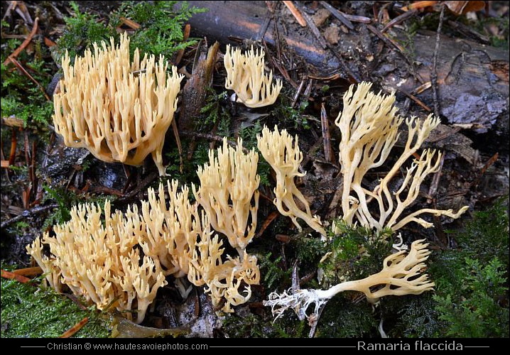 ![]() Photo : Ramaria flaccida - Lieu : Saint Jorioz - Appareil : Nikon D7000 - JPG de 16 Mpixels en 2012 - © Christian ![]() Photo : Clavaire flasque - Lieu : Saint Jorioz - Appareil : Nikon D7000 - JPG de 16 Mpixels en 2012 - © Christian - Carpophore : 2 à 6cm de haut, jaune-brun terne à crème-brunâtre, en rameaux de ø1 à 3mm, terminés par 2 ou 3 petites pointes plus claires. Chair : blanchâtre à jaunâtre, tenace - Lames : néant - Sporée : jaune orangé - Pied : base blanche, ancré de 2 à 3 cm dans le sol. Habitat : grégaire, sur la litière d'aiguilles sous les conifères, plus particulièrement les épicéas - Visible : août à octobre. |