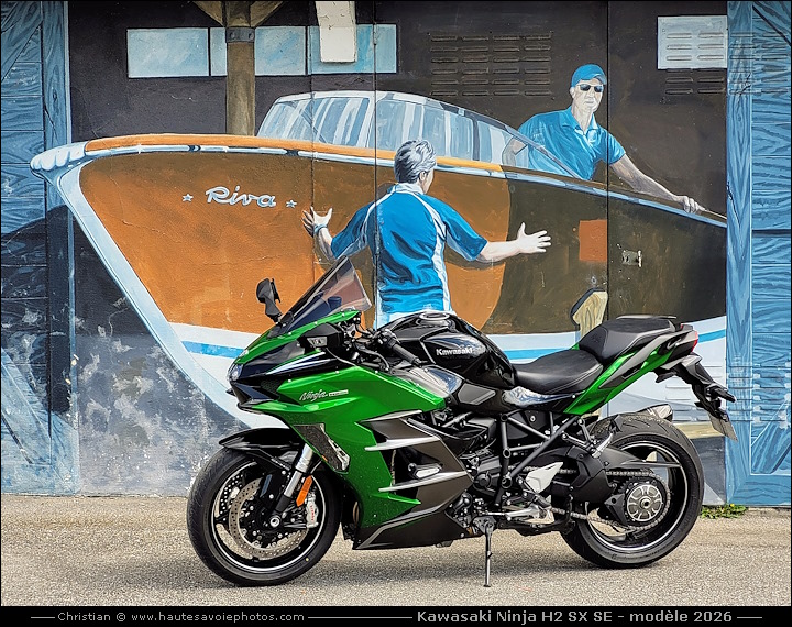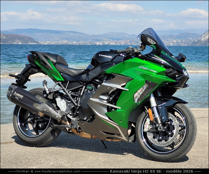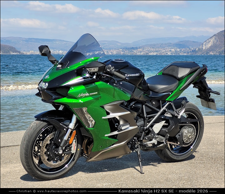 ![]() Photo : rodage de 230km de la Kawasaki - Lieu : Saint Eustache - Appareil : Samsung S20FE - JPG de 12 Mpixels en 2023 - © Christian Moteur : 4 cylindres en ligne de 998cm³ avec compresseur, 4 temps, 16 soupapes, puissance 200ch à 11000tr/min, couple 137Nm à 8500tr/min. Boite 6 vitesses avec shifter. Fourche AV inversée Ø43 débatement 120mm, amortisseur AR Uni-Trak avec BFRC et KECS débatement 139mm. Frein avant : double disque Brembo Stylema 320mm, frein arrière : disque 250mm. Pneu avant : 120/70-17, pneu arrière : 190/55-17. Tableau de bord TFT en couleur de 6,5 pouces. 3 modes de contrôle de traction et avec un régulateur de vitesse adaptatif. Hauteur de selle 835mm, garde au sol 130mm, empattement 1480mm, chasse de 24,7°, réservoir 19L, poids 267kg tous pleins faits. ![]() Photo : Kawasaki Ninja H2 SX SE modèle 2023 - Lieu : Duingt - Appareil : Samsung S20FE - JPG de 12 Mpixels en 2023 - © Christian MON AVIS : agréablement suppris par cette jolie moto hors du commun qui sait être douce au quotidien et puis explosive si on la taquine. LES PLUS : le compresseur, moto assez confortable, suspensions efficaces, bonne tenue de route, freinage endurant et performant, boîte de vitesse assez douce, shifter efficace, moteur souple à bas régime et explosif quand on déchaine le compresseur, grand écran TFT complet et lisible, poignées chauffantes, régulateur de vitesse, électronique et équipements complets, selle pilote et passager assez confortable, poignées de maintien passager, bagagerie en option élégante et pratique. LES MOINS : pot d'échappement massif, bulle un peu petite, poids un poil élevé, prix conséquant... ![]() Photo : Kawasaki Ninja H2 SX SE - Lieu : Duingt - Appareil : Samsung S20FE - JPG de 12 Mpixels en 2023 - © Christian ![]() Photo : Kawasaki Ninja H2 SX SE - Lieu : Duingt - Appareil : Samsung S20FE - JPG de 12 Mpixels en 2023 - © Christian ![]() Photo : compteur de la Ninja 1000 H2 SX SE - Lieu : Saint Eustache - Appareil : Samsung S20FE - JPG de 12 Mpixels en 2023 - © Christian ![]() Photo : freins Brembo de la Ninja H2 SX SE - Lieu : Saint Eustache - Appareil : Samsung S20FE - JPG de 12 Mpixels en 2023 - © Christian ![]() Photo : moteur 1000cc à compresseur de 200cv - Lieu : Saint Eustache - Appareil : Samsung S20FE - JPG de 12 Mpixels en 2023 - © Christian ![]() Photo : monobras de la Ninja H2 SX SE - Lieu : Saint Eustache - Appareil : Samsung S20FE - JPG de 12 Mpixels en 2023 - © Christian ![]() Photo : feux arrière de la Ninja H2 SX SE - Lieu : Saint Eustache - Appareil : Samsung S20FE - JPG de 12 Mpixels en 2023 - © Christian ![]() Photo : clignotant de la Ninja H2 SX SE - Lieu : Saint Eustache - Appareil : Samsung S20FE - JPG de 12 Mpixels en 2023 - © Christian ![]() Photo : rétroviseur de la Ninja H2 SX SE - Lieu : Saint Eustache - Appareil : Samsung S20FE - JPG de 12 Mpixels en 2023 - © Christian ![]() Photo : comodo gauche de la Ninja H2 SX SE - Lieu : Meythet - Appareil : Samsung S20FE - JPG de 12 Mpixels en 2023 - © Christian ![]() Photo : Kawasaki Ninja H2 SX SE - Lieu : Tresserve - Appareil : Samsung S20FE - JPG de 12 Mpixels en 2026 - © Christian ![]() Photo : rodage de 415km de la Ninja - Lieu : Saint Jorioz - Appareil : Samsung S20FE - JPG de 12 Mpixels en 2026 - © Christian ![]() Photo : Kawasaki Ninja H2 SX SE - Lieu : Saint Jorioz - Appareil : Samsung S20FE - JPG de 12 Mpixels en 2026 - © Christian
