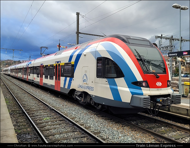 ![]() Photo : rame Flirt de Stadler des CFF - Lieu : gare d'Annecy - Appareil : Samsung S20FE - JPG de 12 Mpixels en 2026 - © Christian Le Léman Express est le premier RER transfrontalier France-Suisse. En 2022 la fréquentation atteignait 70000 passagers/jour La flotte est composée de trains Flirt du constructeur suisse Stadler et de trains Régiolis du constructeur français Alstom. Sept lignes desservent des villes suisses et françaises sur un réseau de 230 kilomètres de voies ferrées.. ![]() Photo : Léman Express rame des CFF - Lieu : gare d'Annecy - Appareil : Samsung S20FE - JPG de 12 Mpixels en 2026 - © Christian ![]() Photo : Léman Express rame des CFF - Lieu : gare d'Annecy - Appareil : Samsung S20FE - JPG de 12 Mpixels en 2026 - © Christian ![]() Photo : rame Flirt de Stadler suisse - Lieu : gare d'Annecy - Appareil : Samsung S20FE - JPG de 12 Mpixels en 2026 - © Christian ![]() Photo : bogie de la motrice Stadler - Lieu : gare d'Annecy - Appareil : Samsung S20FE - JPG de 12 Mpixels en 2026 - © Christian ![]() Photo : bogie des voitures voyageurs - Lieu : gare d'Annecy - Appareil : Samsung S20FE - JPG de 12 Mpixels en 2026 - © Christian ![]() Photo : rame Régiolis d'Alstom de la SNCF - Lieu : gare d'Annecy - Appareil : Samsung S20FE - JPG de 12 Mpixels en 2026 - © Christian ![]() Photo : Léman Express rame de la SNCF - Lieu : gare d'Annecy - Appareil : Samsung S20FE - JPG de 12 Mpixels en 2026 - © Christian |
