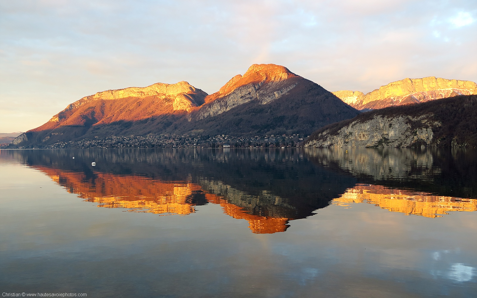 2 fonds d'écran en 1600x1000 pixels : le Mont Veyrier et la Tournette illuminés par le soleil couchant qui se reflètent sur l'eau du lac d'Annecy / 2 wallpapers of landscapes
